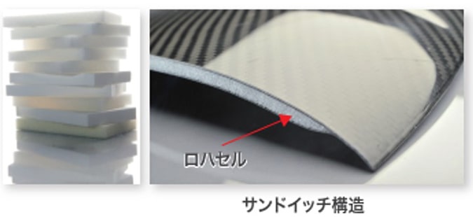 硬質発泡体ロハセル®はサンドイッチ構造のコア材として使用され、ロハセル®単独で使用されることはほとんどありません。その発泡体は100%独立した気泡で形成されているため、耐クリープ圧縮性に優れ、機械的強度にも優れています。またマトリックス樹脂はロハセル®の最表層よりも内部には含浸しないため、より軽量化することができます。