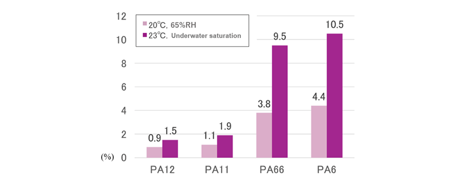 For example, as shown below, PA12 has a lower water absorption than PA6 and PA66. In particular, in terms of saturated water absorption in underwater environments, PA12 absorbs only about one-sixth of the water that PA6 and PA66 do.