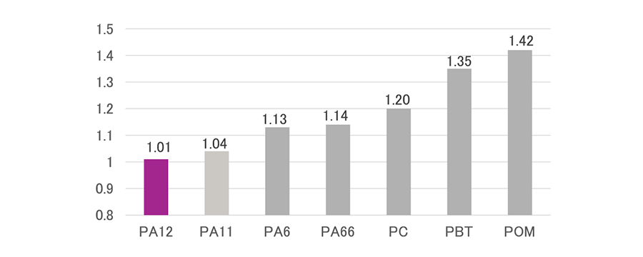In addition to low water absorption, PA12 also has a low specific gravity. As shown in the graph below, you can see that PA12 has a much lower specific gravity than other resins. This leads to weight reduction in a variety of fields. For example, in the automotive field, switching from metal pipes to plastic tubes contribute to reducing the weight of cars. In addition, in the sports field, PA12 is used in the soles of shoes, which can also reduce the weight of shoes and lead to a comfortable fit.