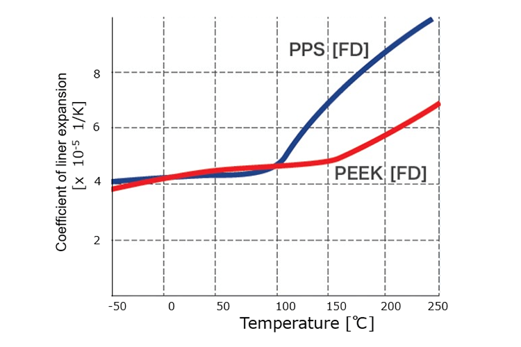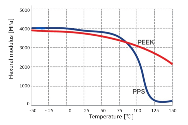 VESTAKEEP® is one of the thermoplastics whose mechanical properties are less sensitive to temperature, making it easier to use and design in high-temperature environments. For example, VESTAKEEP® has better heat resistance than PPS (polyphenylene sulfide) which is widely used as a high heat resistant engineering plastic. This advantage can be seen in the right graph, which shows the temperature dependence of the mechanical properties of VESTAKEEP® and PPS materials. PPS’s Tg is about 90℃, while VESTAKEEP®’s Tg is about 150℃.