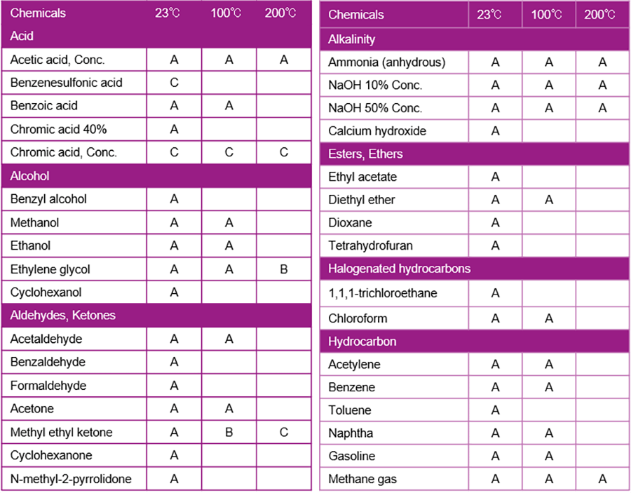 VESTAKEEP® has the second highest chemical resistance after fluoropolymers. VESTAKEEP® has been used for many years in the semiconductor manufacturing process, where it is exposed to contact and immersion at high temperature. In addition, PA (polyamide) and TPU (thermoplastic polyurethane elastomers) has weakness in hydrolysis resistance. Unlike those material, VESTAKEEP® have excellent hydrolysis resistance. Moreover, VESTAKEEP® has one of the highest levels of radiation resistance among various resins. Due to the advantage of these features, VESTAKEEP® is used in parts of medical equipment that require gamma ray and steam sterilization, as well as parts of oil and gas drilling equipment that are exposed to high temperature and high humidity. Below is a graph showing the chemical resistance and hydrolysis resistance of VESTAKEEP®.