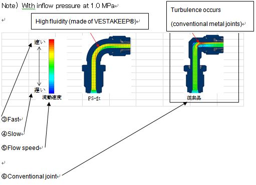 従来の金属性継ぎ手に比べ、PEEK樹脂の継ぎ手は重量を約80%軽量化するとともに、特殊な射出成形法を用いることにより配管内部における流路の平滑性を実現しました。 それにより内部を流れる液体の乱流を防止し、液体が継ぎ手内部に液溜まりを作らず優れた流動性を発揮します。PEEK樹脂の継ぎ手は繰り返しの使用にも作業効率の向上と高い生産性を確立しています。