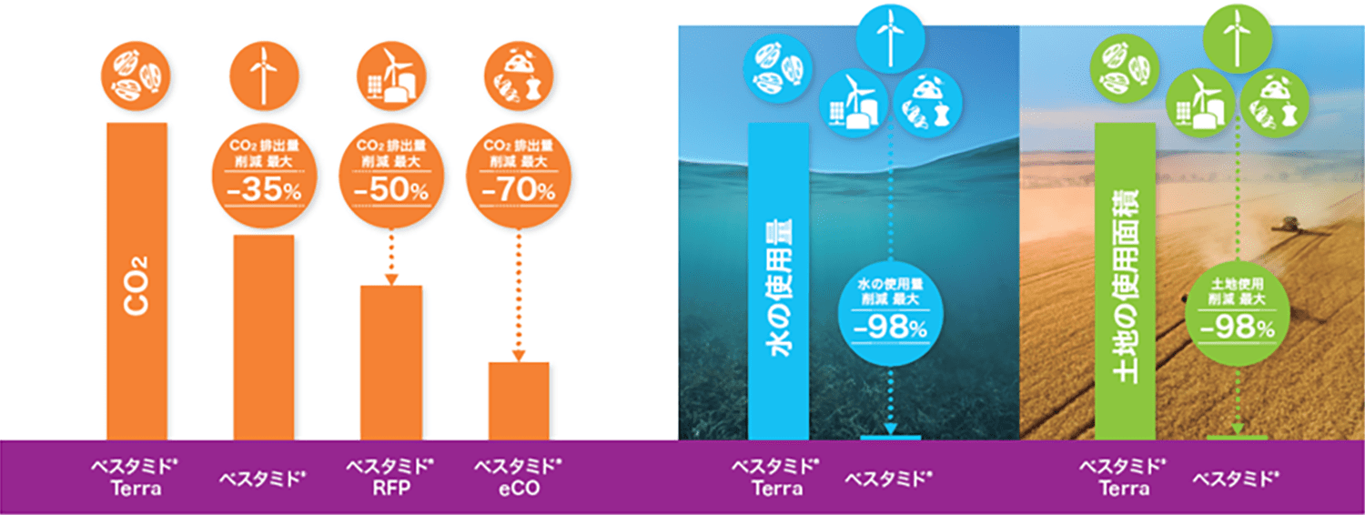 「ベスタミド® eCO」はさらに再生可能エネルギーとバイオサーキュラー原料を活用し、最大70%を削減しています。