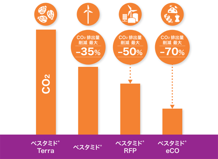 また、ベスタミド® eCOはさらに再生可能エネルギーとバイオサーキュラー、または製造工程での燃料にバイオマス原料なども活用し、最大70%の削減が可能な見込みです。